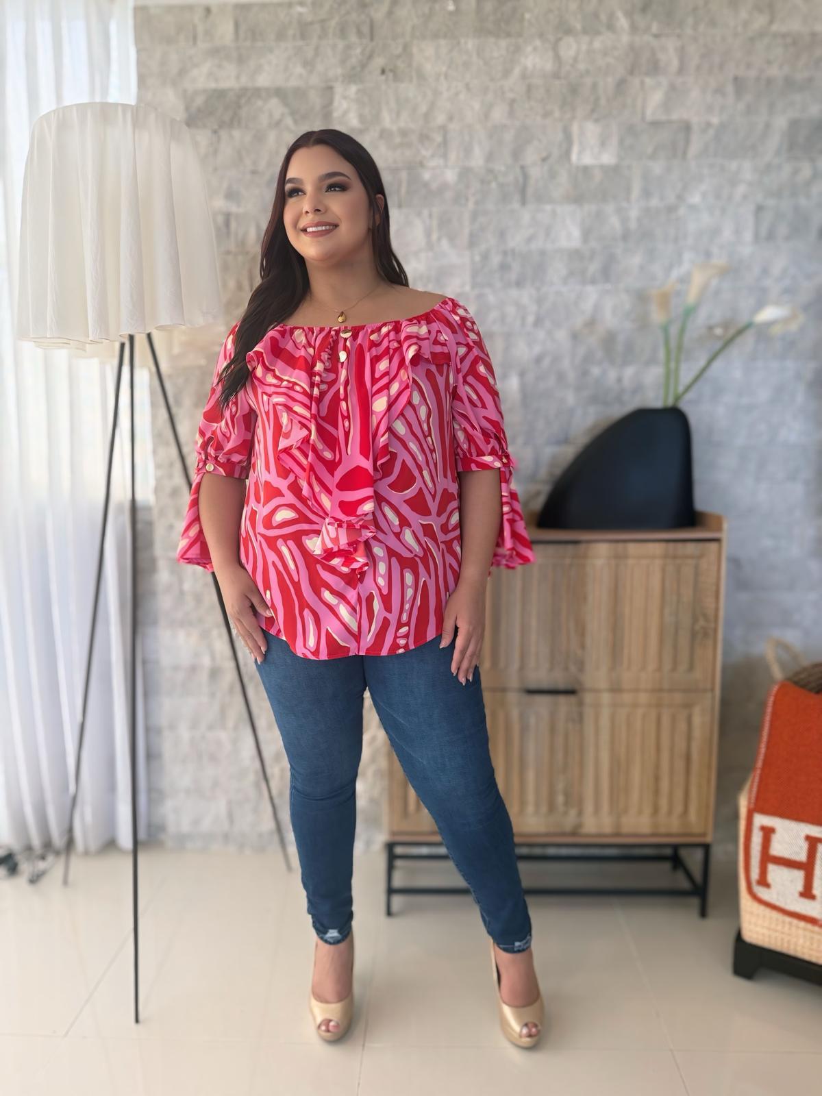 Blusa plus size estampada en tonos fucsia y verde con diseño moderno y vibrante, ideal para elevar tus outfits casual chic.