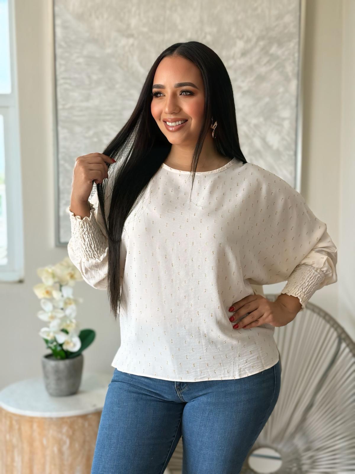 Ilumina tu look con la elegancia discreta de nuestra Bohemian Glitter Details Top, una pieza básica con ese toque especial que eleva cualquier outfit. Su diseño relajado y moderno la convierte en una favorita para el día a día o para ocasiones especiales donde el comfort y el estilo van de la mano.