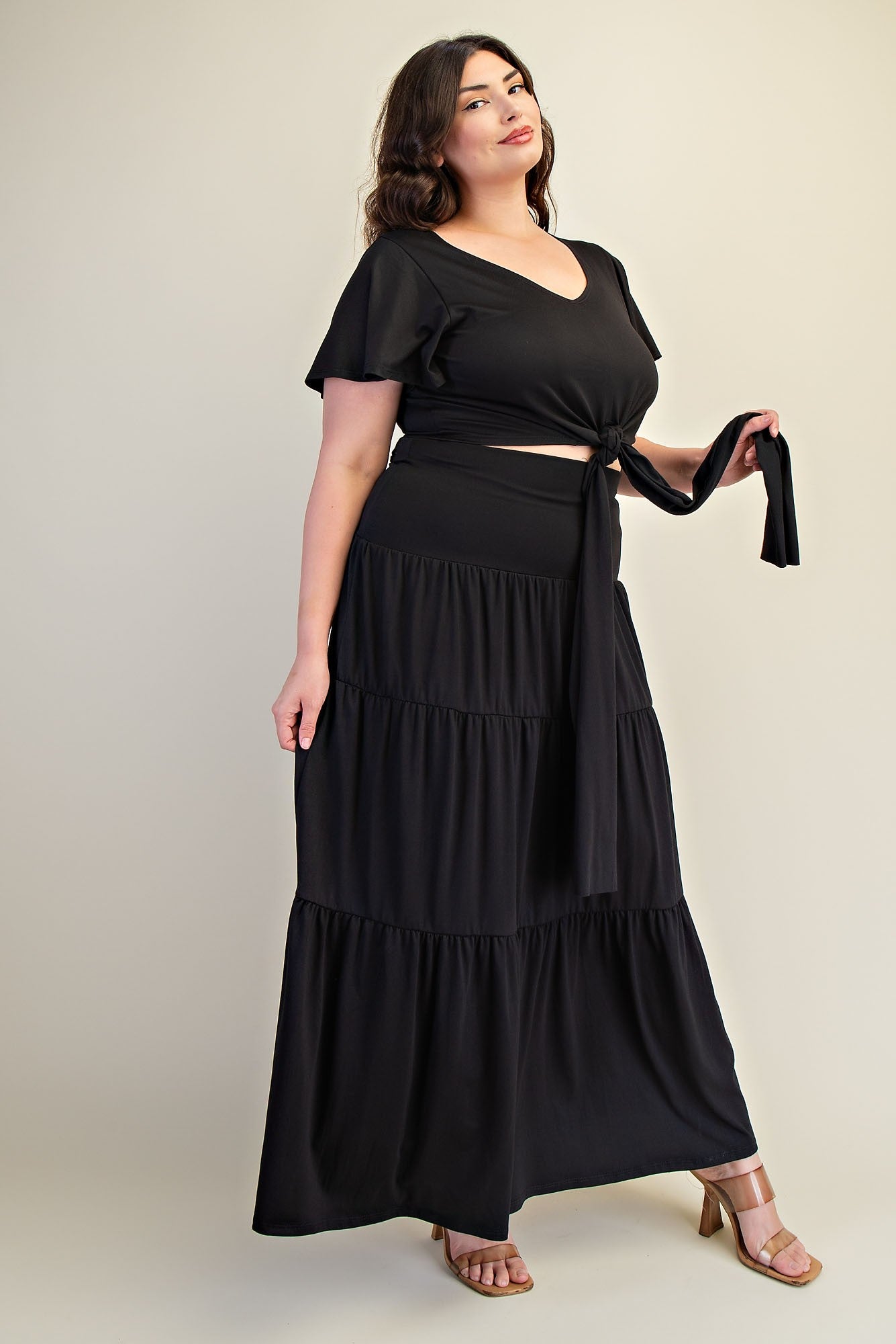 Versatil set de dos piezas con falda estilo maxi de diseño fluido y silueta estilizada que aporta movimiento y sofisticación.