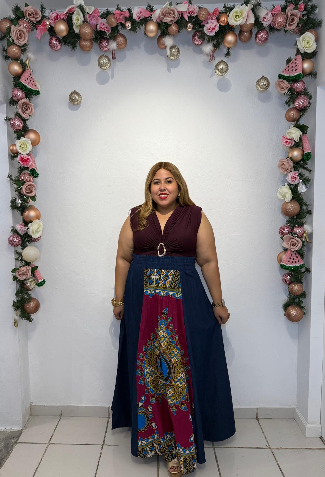 Dale un toque vibrante y cultural a tu guardarropa con nuestra Falda Denim Flair, una pieza llamativa que fusiona el estilo bohemio con la elegancia caribeña. Esta falda larga de corte tipo A combina un hermoso panel central en estampado africano Ankara en tonos vino, mostaza, azul y negro, con laterales en tela tipo denim liviano que le aportan estructura y caída fluida.
