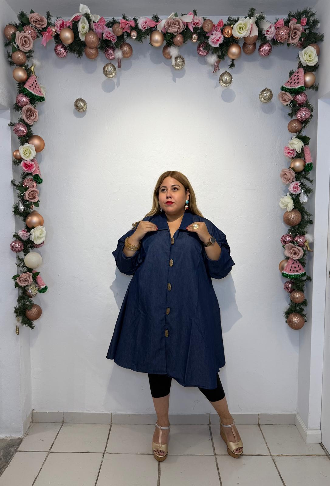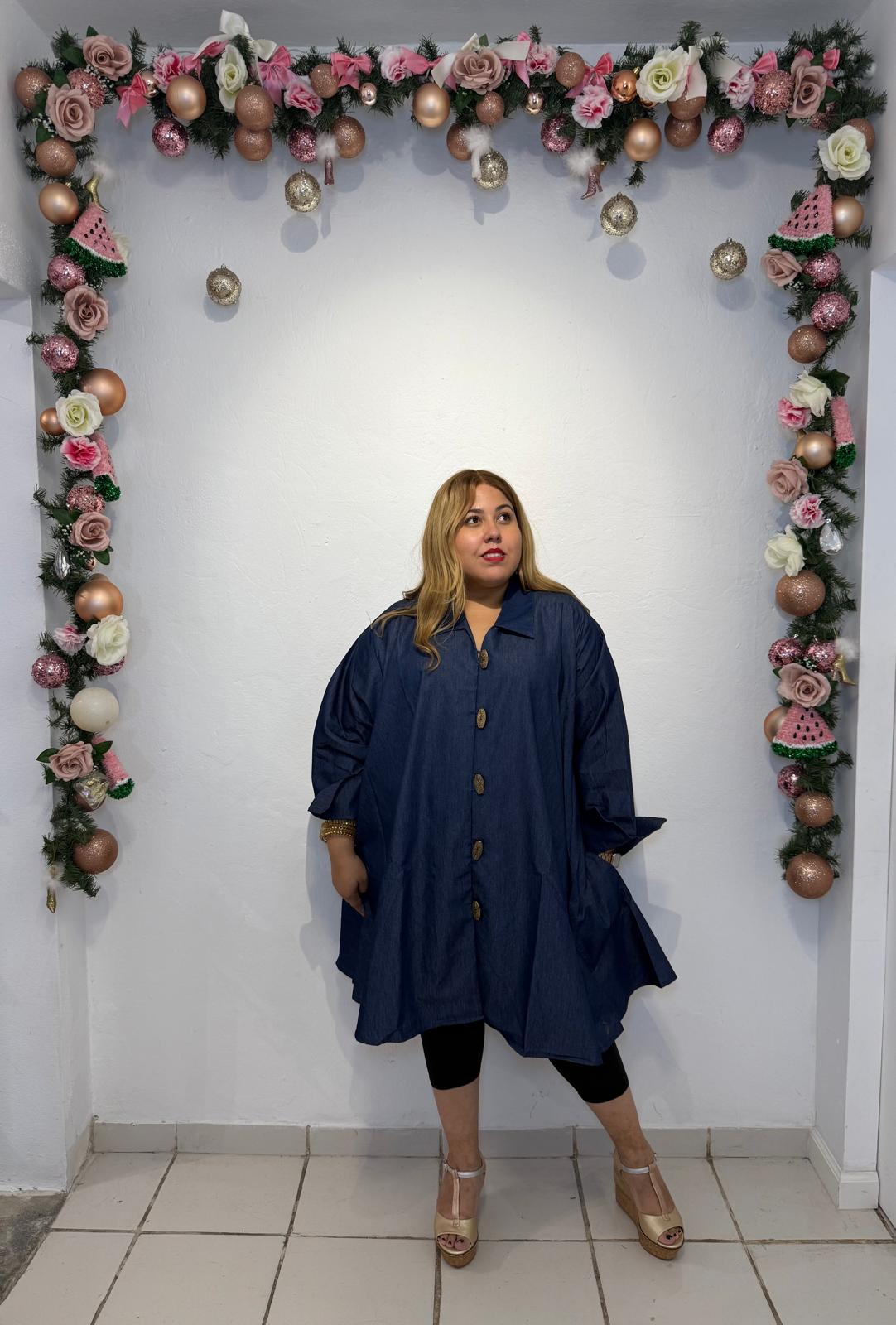Este blusón denim en corte tipo túnica es el balance perfecto entre comodidad y estilo. Confeccionado en tela de mahón sin stretch, presenta una silueta oversize de talla única que se adapta con fluidez a cuerpos desde L hasta 5XL.