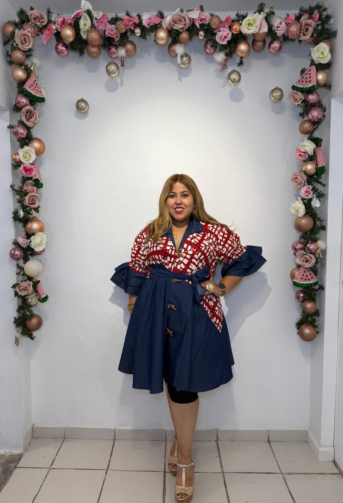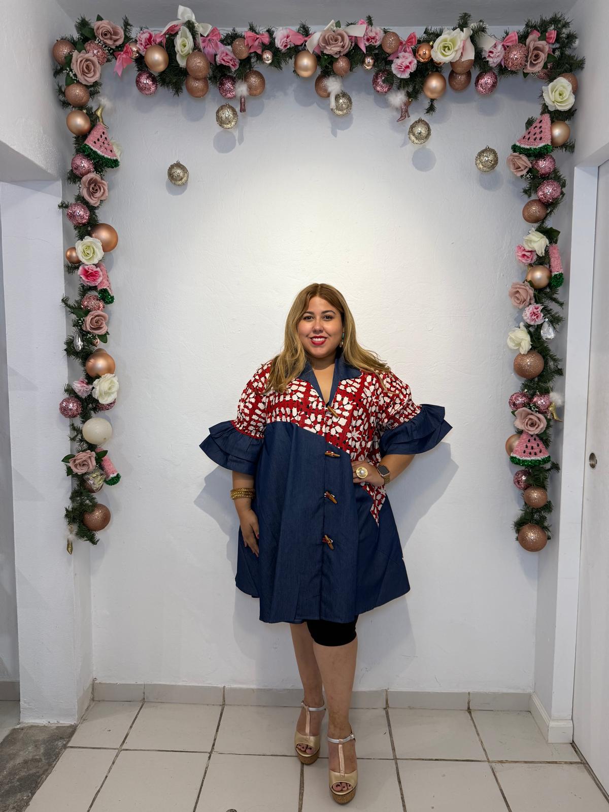 Añade estilo y personalidad a tu guardarropa con este blusón oversize en denim con estampado tribal rojo. Su diseño estructurado combina una base de denim azul oscuro con detalles estampados en rojo y blanco, logrando una fusión perfecta entre lo casual y lo artístico. El cuello camisero y los botones tipo nudo aportan un toque distintivo, mientras que las mangas con volantes añaden volumen y sofisticación.