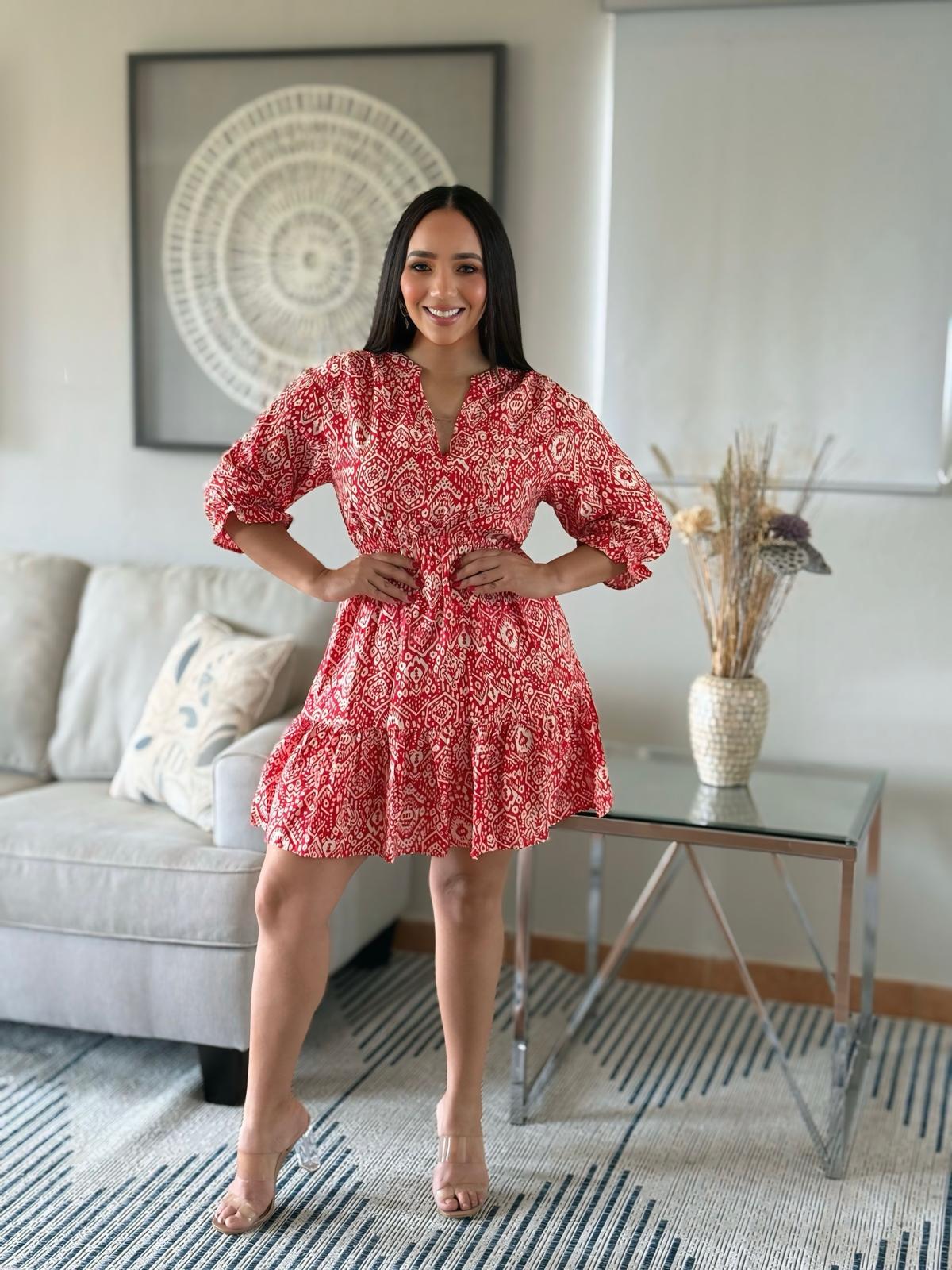 Descubre el encanto versátil de nuestro Vestido Boho Chic con Estampado Étnico, disponible en tres tonalidades modernas: beige, rojo vibrante y verde oliva. Su diseño con mangas largas abullonadas, escote en “V” favorecedor y falda con vuelo aporta frescura, comodidad y elegancia para cualquier ocasión.