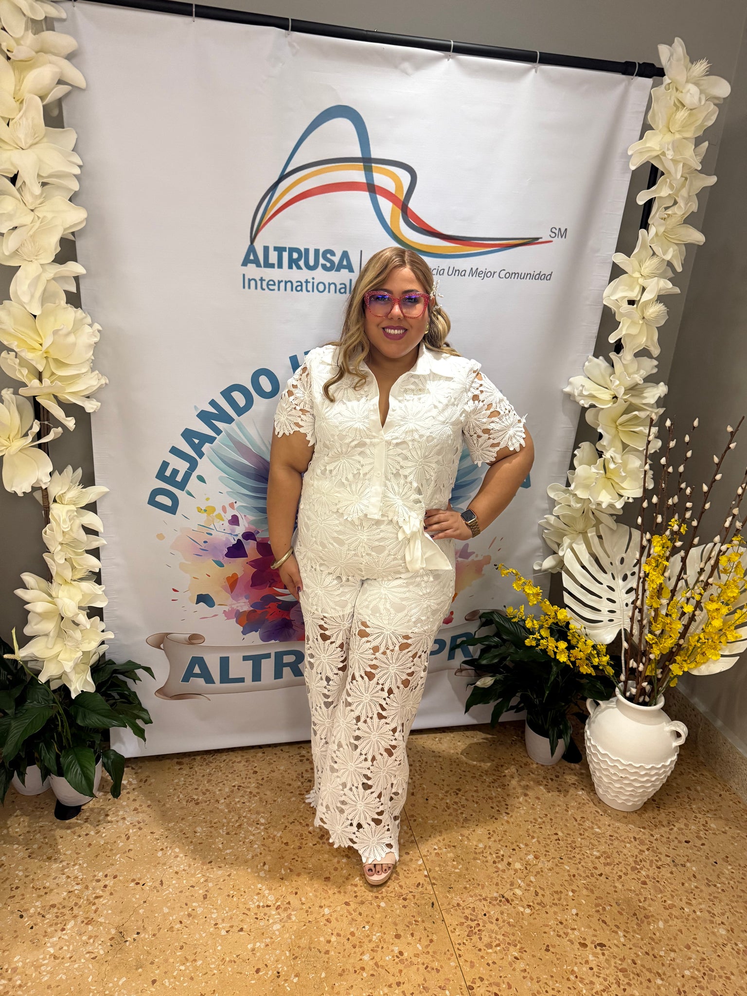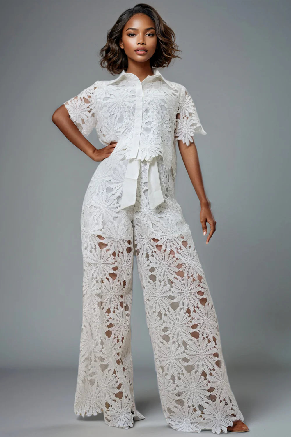 Confeccionado en tela bordada de flores tipo guipur, incluye un top tipo camisa de botones con cuello clásico y mangas cortas, y un pantalón palazzo de corte ancho, ambos con diseño transparente que realza tu silueta con elegancia y modernidad.