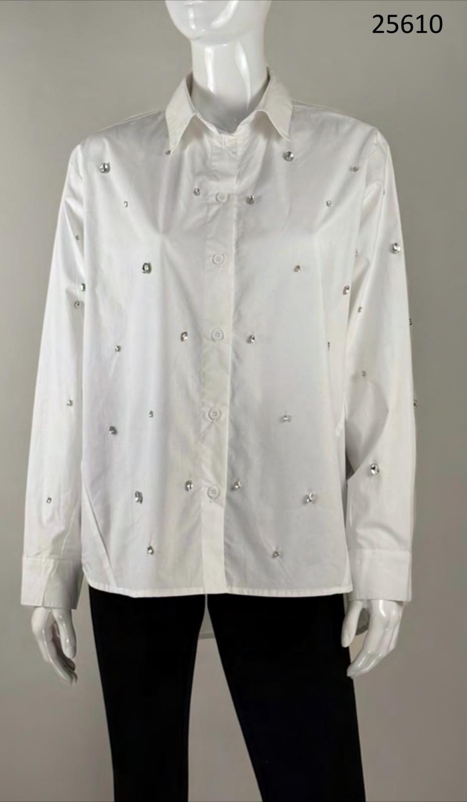 La Camisa Glam Sparkle eleva el clásico blanco a un nuevo nivel de sofisticación. Confeccionada en una tela fresca y estructurada, presenta un diseño de botones frontales con detalle de rhinestones distribuidos cuidadosamente que añaden brillo sutil y elegancia moderna.
