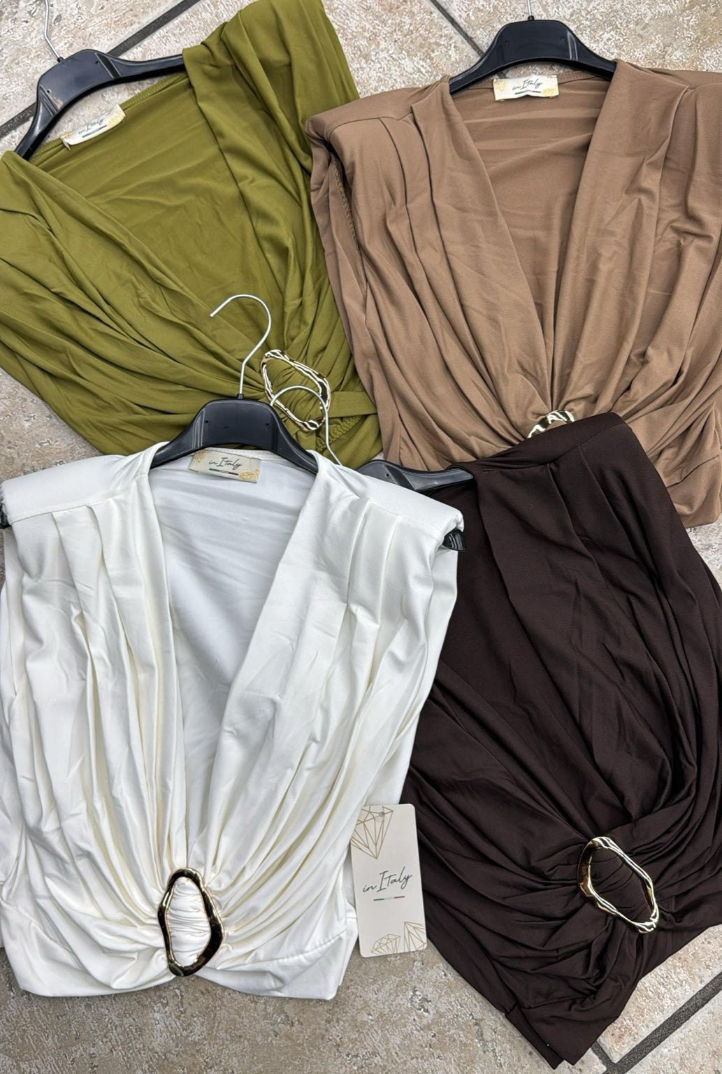 Diseñado con escote en V profundo y hombreras integradas, logra una silueta sofisticada y empoderada. El detalle frontal con broche dorado acentúa la figura y añade un toque de lujo moderno.