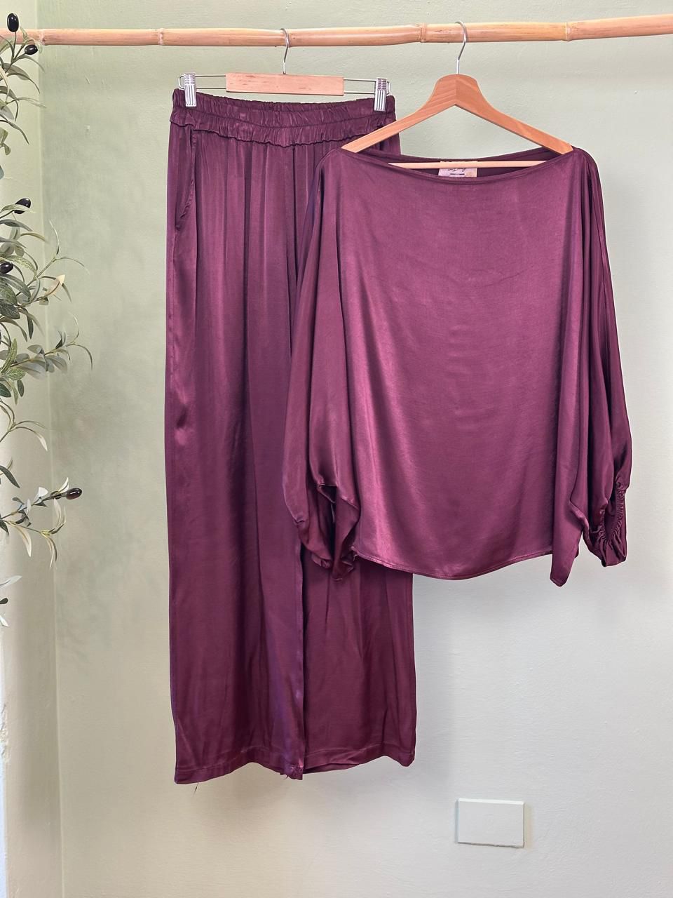 Sofisticación en cada movimiento con este hermoso conjunto de Top y Pantalón que puedes comprar en conjunto o separado. Confeccionado en satén ligero y fluido, se ajusta delicadamente a tu silueta con caída suelta y mangas largas abullonadas. Su escote recto tipo barco enmarca los hombros para un look sutilmente sensual y elegante.