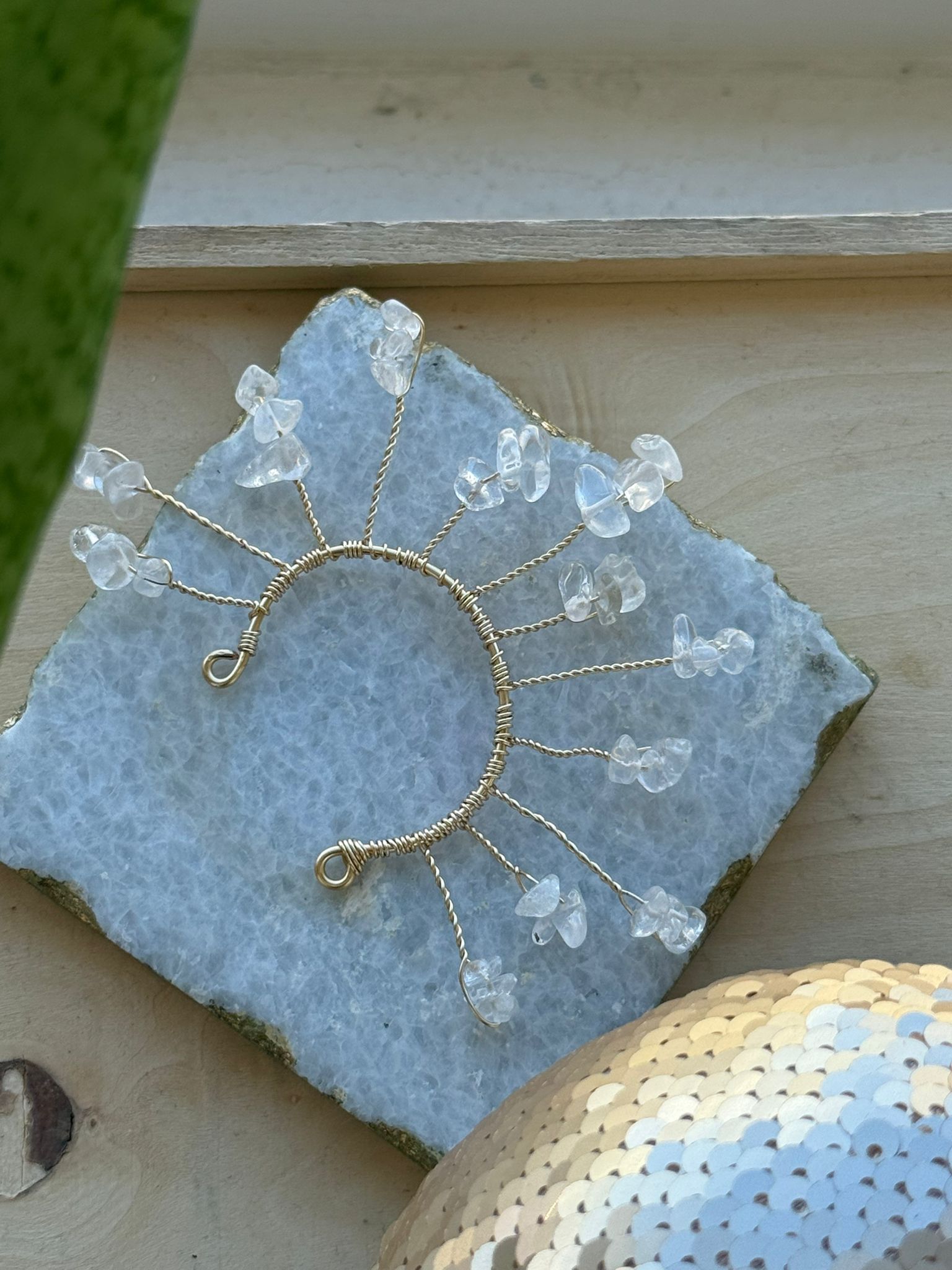 Ya sea que elijas el modelo con perlas barrocas, perlas clásicas o cuarzos transparentes, cada earcuff es una declaración de estilo que mezcla el arte del wire wrapping con inspiración bohemia, femenina y espiritual.