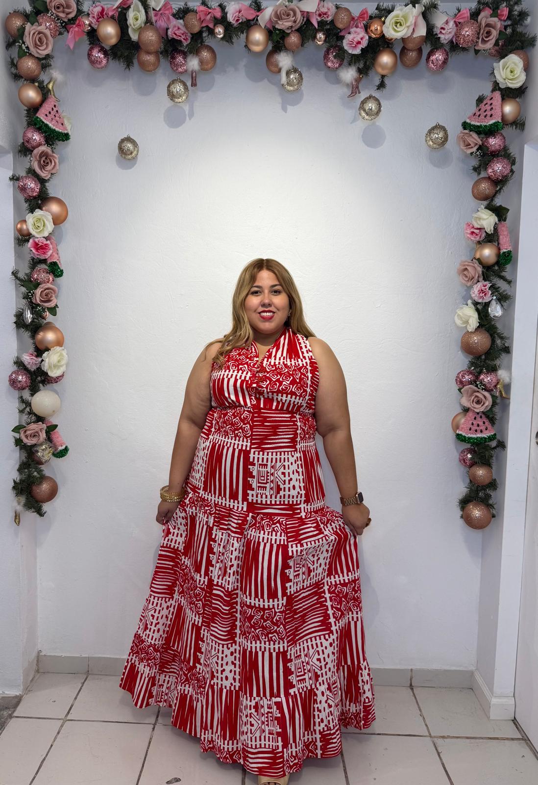 Siente la alegría del Caribe con este hermoso Vestido, una pieza maxi que combina comodidad y elegancia con un estampado vibrante en tonos rojo y blanco. Este diseño tipo halter sin mangas presenta una silueta fluida y favorecedora, con falda amplia de caída ligera que aporta movimiento y frescura a tu look.